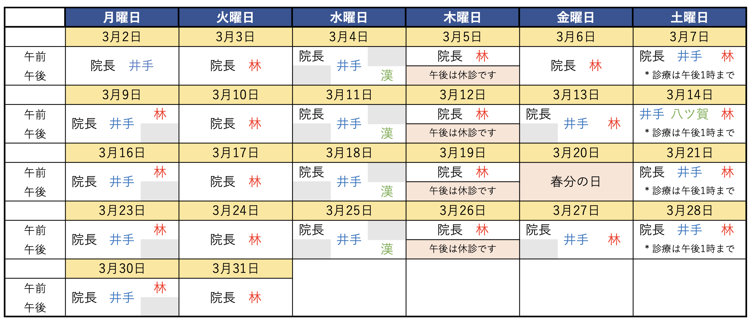 3月14日(土) 院長の診察はお休みです。 3月6日(金) 井手先生の外来はお休みです。 3月2日(月) 林先生の外来はお休みです。 ※上記日程以外は通常通り診療を行います。 ...