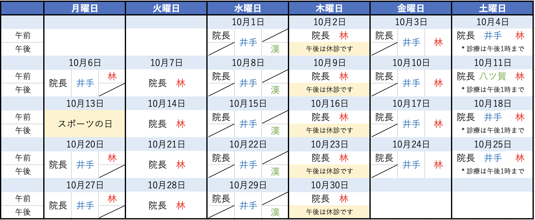 毎週水曜の午後/金曜の午後:院長の外来は休診です。 10月11日(土):井手先生の外来は休診です。 ...